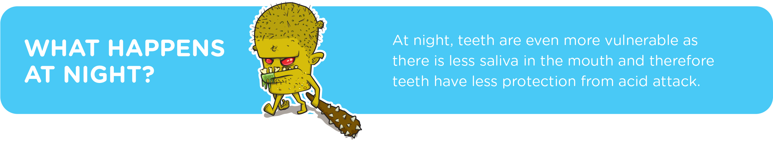 Dental decay occurs when sugars in food are turned into acid by particular bacteria on the teeth. The acid attach can last up to 1 hour and calcium is lost from the teeth. Saliva is the mouths natural protection and can give back some calcium to the teeth- so in the very early stages, decay can be reversed. But frequent acid attacks can weaken the enamel so much that the damage is permanent and a cavity forms.